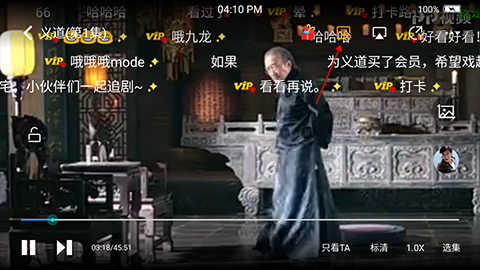 2、接着在横屏播放页面中点击任意位置,这时在播放页面顶部右侧会出现一个橙色的弹幕图标(下图红色箭头所指)橙色代表弹幕是开启状态,用户点击这个图标就会关闭弹幕