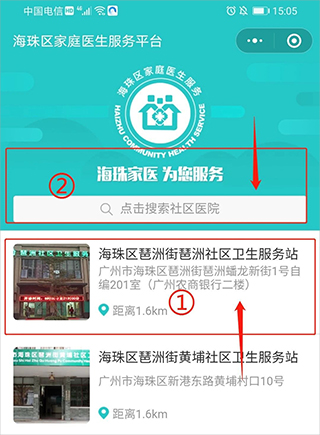 2、点击“海珠区琶洲街琶洲社区卫生服务站”,或者在搜索栏输入“海珠区琶洲街琶洲社区卫生服务站”。
