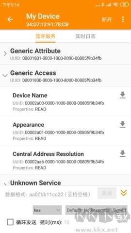 3、蓝牙连上之后,可以看到一共四个蓝牙服务,Generic Access、Generic Attribute以及两个Unknown Service;