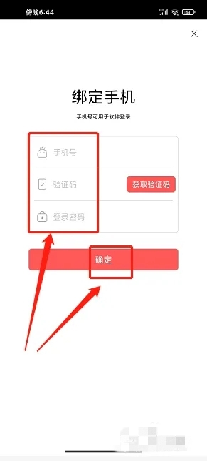 进入绑定手机界面,输入手机号、验证码、登录密码,点击【确定】。